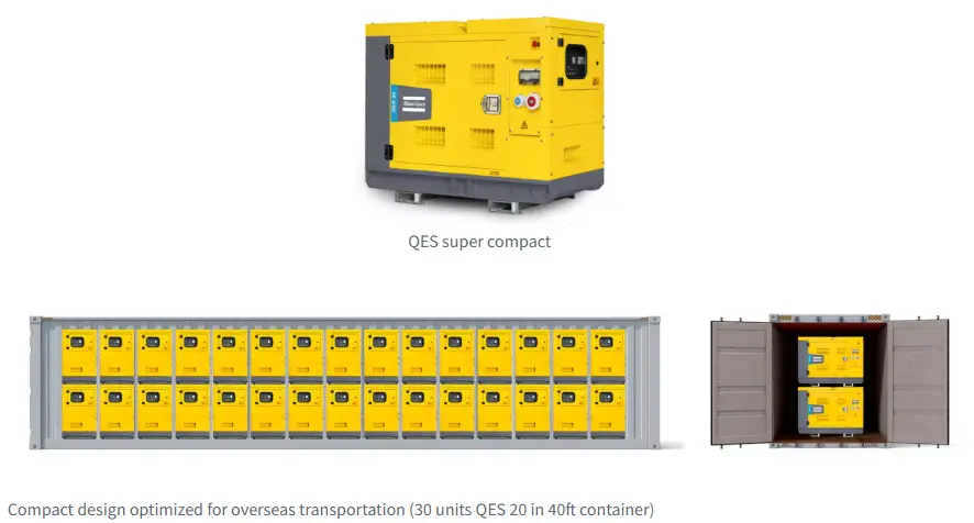 ຮູບແບບ QES ທີ່ມີນະວັດຕະກໍາທີ່ກະທັດຮັດທີ່ສຸດໄດ້ຖືກອອກແບບເພື່ອໃຫ້ການຂົນສົ່ງທີ່ມີປະສິດທິພາບທີ່ສຸດ. ທ່ານສາມາດໃສ່ໄດ້ເຖິງ 30 ຫນ່ວຍຂອງ Atlas Copco QES 20 ໃນຕູ້ຄອນເທນເນີ 40 ຟຸດ, ທີ່ສຸດສໍາລັບເຄື່ອງກໍາເນີດໄຟຟ້າ 20kVA Atlas ໃນຕະຫຼາດ! ມັນຫມາຍຄວາມວ່າການຂົນສົ່ງທີ່ດີທີ່ສຸດ, ການຫຼຸດຜ່ອນການປ່ອຍອາຍພິດ CO2 ແລະຄ່າໃຊ້ຈ່າຍໃນການດໍາເນີນງານ, ເຊິ່ງເຮັດໃຫ້ຄ່າໃຊ້ຈ່າຍໃນການເປັນເຈົ້າຂອງທັງຫມົດ (TCO). ການອອກແບບທີ່ເປັນມິດກັບສິ່ງແວດລ້ອມຂອງມັນເຮັດໃຫ້ມັນເຫມາະສົມສໍາລັບການເກັບຮັກສາຢູ່ຕ່າງປະເທດ, ຫຼຸດຜ່ອນຮອຍຕີນຂອງເຈົ້າຢູ່ໃນເວັບໄຊ.