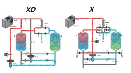 ເຄື່ອງອົບເຄື່ອງດູດຄວາມຮ້ອນແບບບີບອັດ XD ຫຼື X ໃຊ້ຕົວດູດຊຶມທີ່ມີຄຸນນະພາບສູງແລະນໍາໃຊ້ຄວາມຮ້ອນຂອງການບີບອັດຈາກເຄື່ອງບີບອັດທີ່ບໍ່ມີນ້ໍາມັນເພື່ອຟື້ນຟູການດູດຊຶມ, ຫຼຸດຜ່ອນການໃຊ້ພະລັງງານແລະຄ່າໃຊ້ຈ່າຍໃນການບໍາລຸງຮັກສາຢ່າງຫຼວງຫຼາຍ.