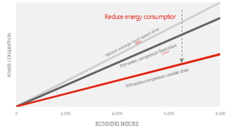 ເຄື່ອງບີບອັດອາກາດ RM Screw ລ້ວນແຕ່ໃຊ້ຫົວຫນ່ວຍປະສິດຕິພາບສູງອັນໃໝ່ອັນໃໝ່, ປະສົມປະສານກັບ IE3 ຄວາມຖີ່ຄົງທີ່ ແລະ ECO*-PM ເທັກໂນໂລຍີມໍເຕີແບບສະກົດຈິດຖາວອນ IE5, ເຊິ່ງສາມາດປະຫຍັດຄ່າໄຟຟ້າໄດ້ເຖິງ 12-30%.